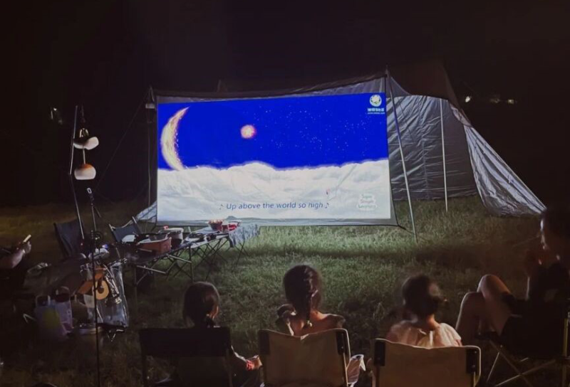 用完餐后看着灰蓝的夜空,缀满了小星星,看着远方的雪山,听着柔和的歌谣,观看一次露天小电影氛围感拉满。放下幕布、摆好投影,大荧幕亮起就是一个露天的电影院,以山野为背景的360°沉浸式观影,带来直面自然的视觉盛宴,奇妙的晚上由此开启。看完电影躺在星空下入眠,抬起头便是满天繁星,放松又享受。