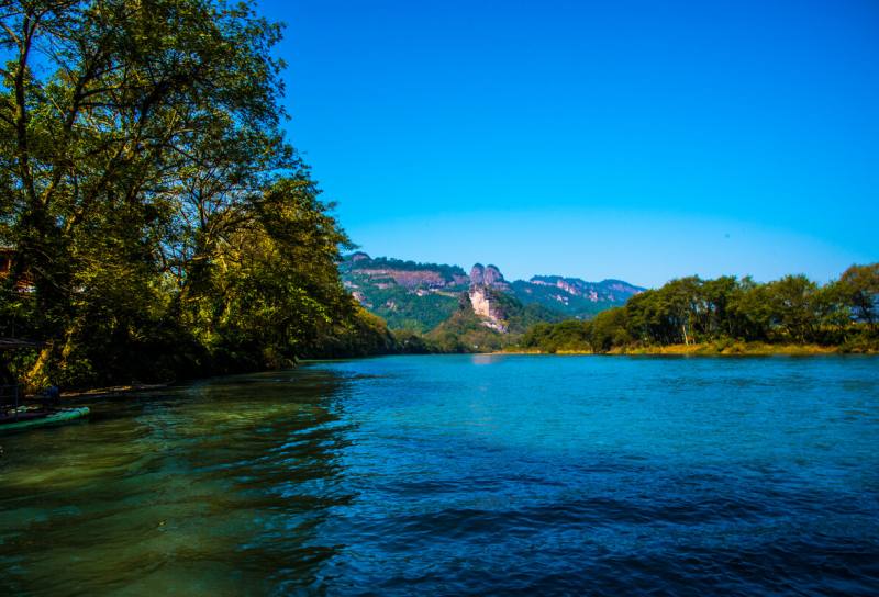 夫夷江漂流。江水清澈见底,平缓如镜,水面宽约100米,窄处70多米。两岸的奇峰异石在碧水蓝天下倒映于水面,船帆点点,竹笛声声,如诗如画。最重要的是欣赏将军石只能坐竹筏顺江漂流,才能深切感受将军石的神韵。