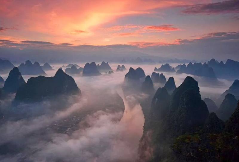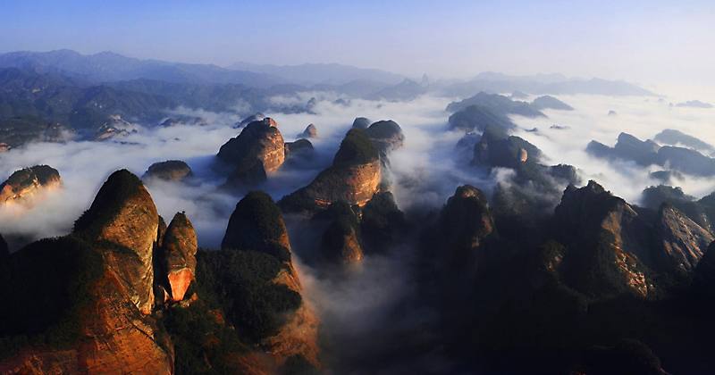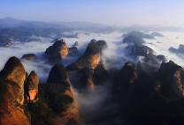 清晨登临八角寨顶,浓雾近漫足趾,远连天涯,无边无际,幽谧如仙界,轻风过处,雾如千军万马团团拢来,呼冲唤杀,结伍夺岭,旌旗飘飘,如遮如掩;绕峰游弋的山峦与弥弥漫漫的白雾时分时合,白雾成浪,一浪接一浪,一浪高过一浪,云海中的山峰或起或伏,或隐或现,令人陡生:“海到无边天作岸,狂涛吞山我为峰”的豪情壮志,一俟风静,雾海亦波平浪静,待到旭日东升,泼洒万缕金光,映得天红如丹,雾红似火。
