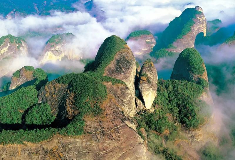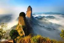 八角寨是我国乃至世界稀有的丹霞峰林地貌,被誉为“丹霞之魂”。在这里,所有的石峰均向一个方向作近几年45度的倾斜,十分奇特,在断崖挽留着白云,云浪抚摸着山腹,岚气轻拂着苍松时,所有的石峰显得跌宕起伏,似大海中的鲸鱼在追逐嬉戏,翻腾闹海。八角寨东、西、南三面均为悬崖绝壁,只有沿着西南坡的一条古老、陡峻崎岖的曲径可登山顶。登斯山顶,方晓天地之博大,悟人生之真谛。四季景色优美,各有观赏特色。