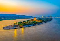 橘子洲四面环水。洲上林木众多、远看如一艘墨绿色的巨舰、逆水扬波护卫着长沙古城。 洲上盛产美橘。故名橘洲、自古以秀丽风光悠久历史著称。是宋代著名的“潇湘八景”之“江天暮雪”所在。橘洲“五六月间无暑气”、是一处消夏胜地。