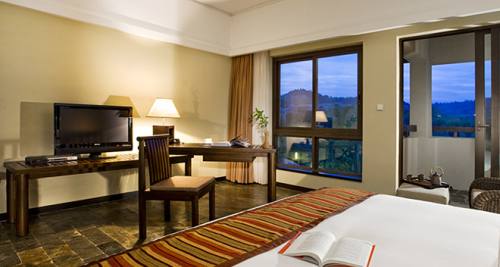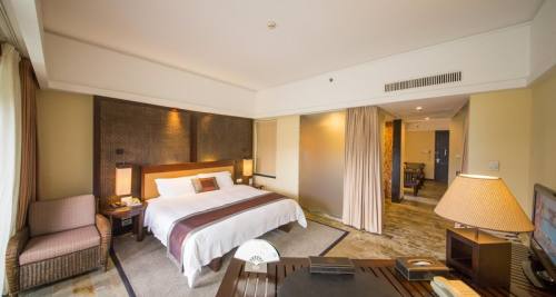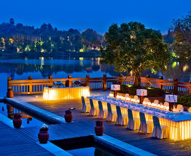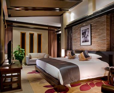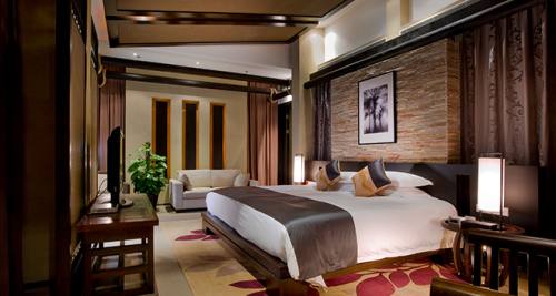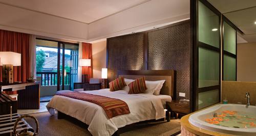 酒店占地约274.8亩,总建筑面积7.3万平方米,并拥有4万多平方米的水面及2万平方米的道路与广场。整体设计古朴典雅,气势宏伟,临湖而建的庭院式建筑主体分为连绵而成的十个区,环绕在丘陵绿地和湿地湖泊之中,营造出人文与自然生态景观融合的氛围,为来自世界各地的尊客提供高品质的休闲度假享受。