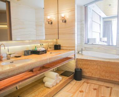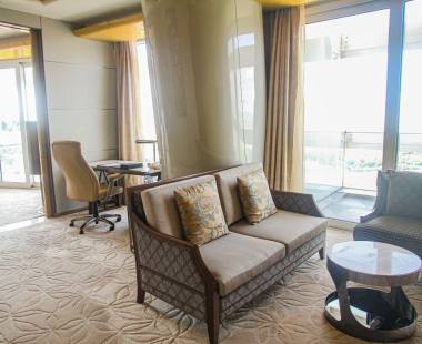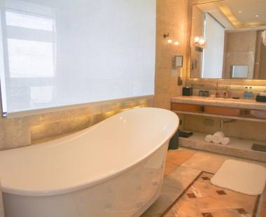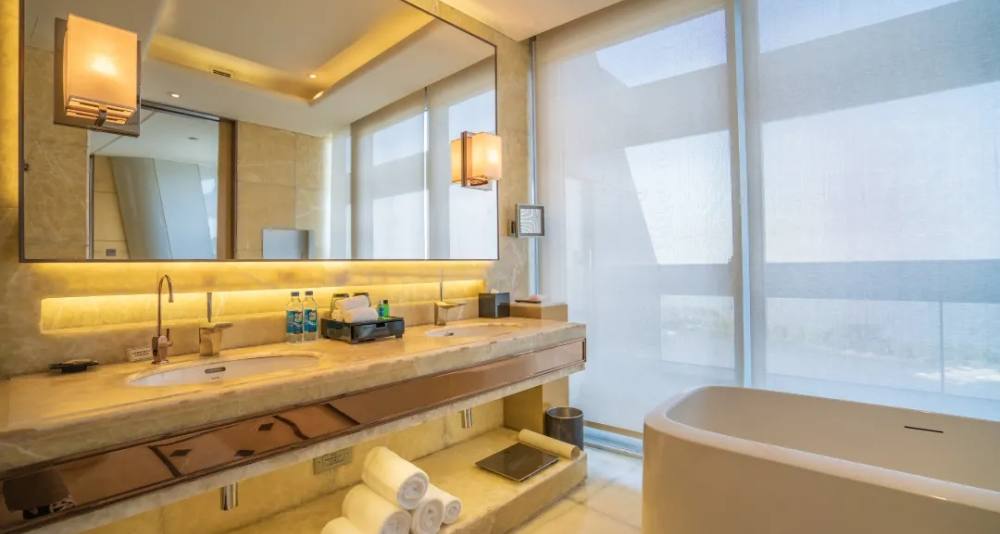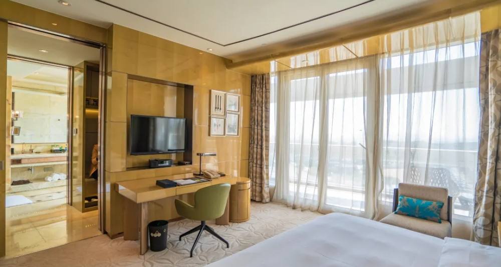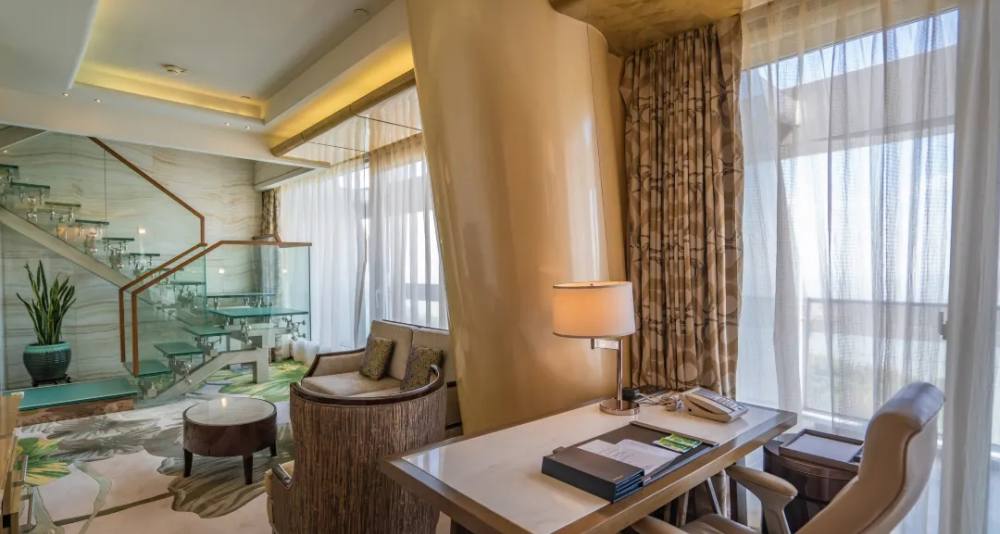酒店的室内装饰尽显高端奢华,大堂的阿富汗白玉、巴西虎眼石、黄水晶可称为是“集世界玉石之大成”。大堂天顶悬挂的2万串施华洛世奇水晶灯,远远望去犹如浪花一般晶莹剔透。