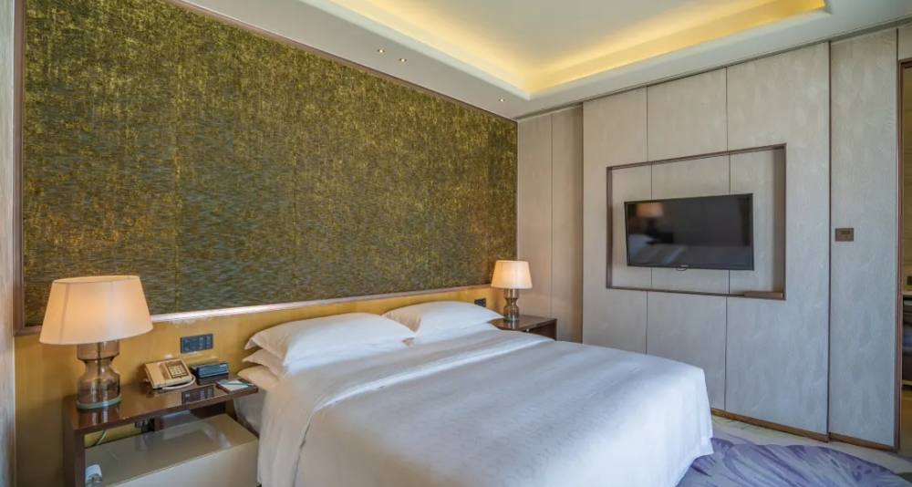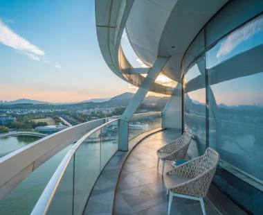 湖州喜来登温泉度假酒店坐落于浙江省湖州市风景宜人的南太湖之滨,晚上在外墙灯光的装扮下 “指环”型建筑变幻出五彩斑斓的绚丽图案,水中的倒影犹如一轮被涂上了色彩的弯月。