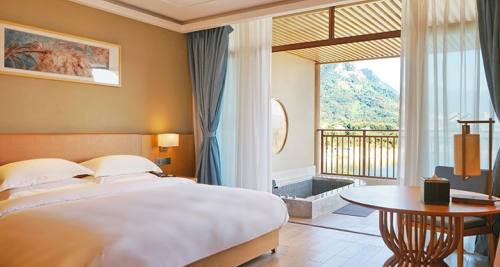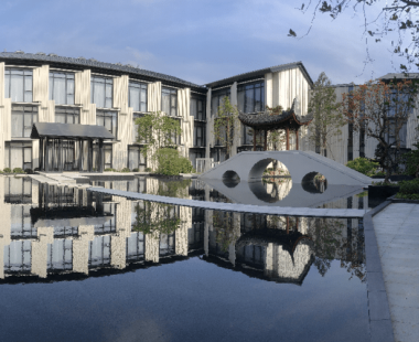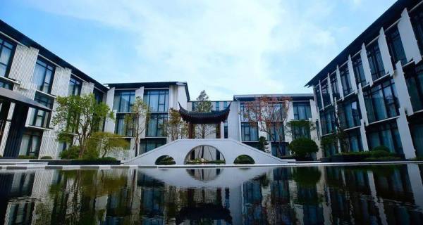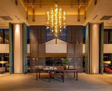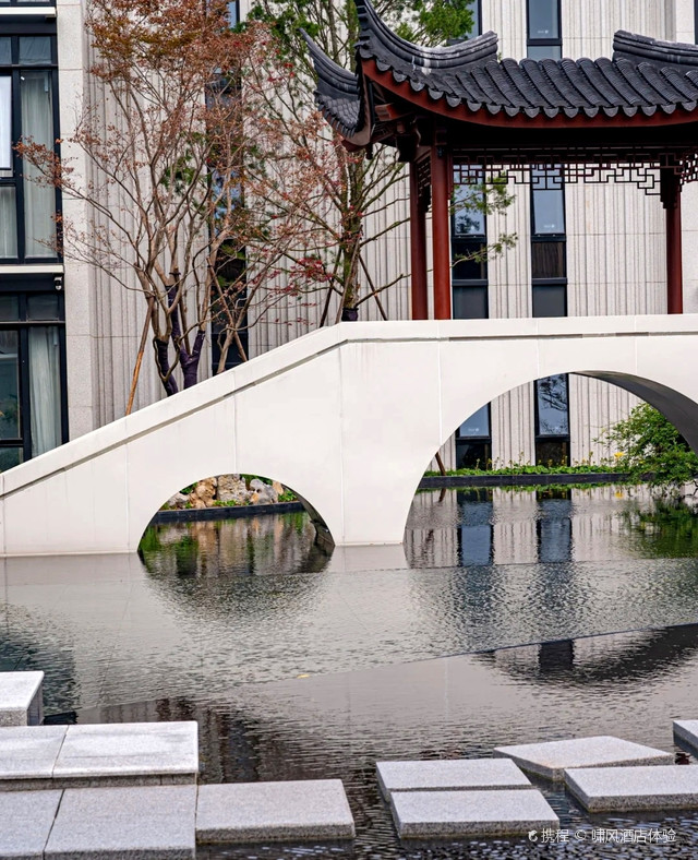 景色怡人,紧致园林,小桥流水,酒店结合了江南园林风格和现代化新中式风格,大堂高耸的湖绿色屏风,处处体现了大气和中国风。一点中国红,一潭南湖绿,每一处的设计都充满了南湖的人文情怀,呈现出东方美学与中式传统元素的惬意相融,体现出“国风雅致。