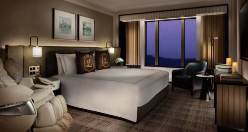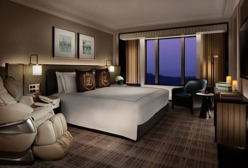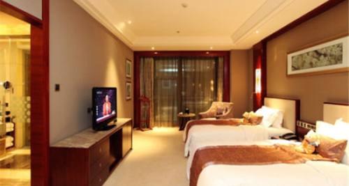 酒店房间里有最豪华的布艺、家具和设以浓重失活泼的色调、豪华舒适、至尊至贵的体验。走入房屋,客厅的地是用木地板做的。墙上挂着一台50寸的液晶电视,高配置按摩椅,柔软舒适,卫生间里干净整洁。