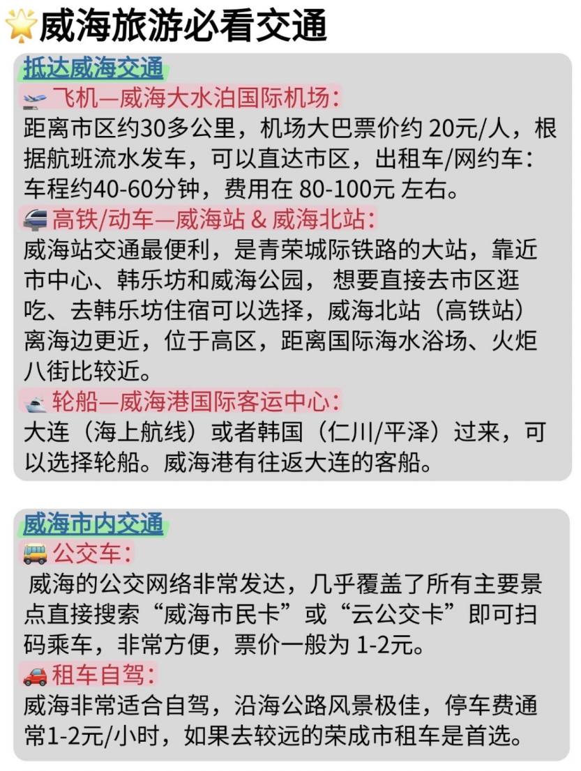 2. 交通出行:威海市区景点间可选公交/共享电动车,前往那香海、海驴岛等周边景点建议拼车或自驾,提前规划约车时间。