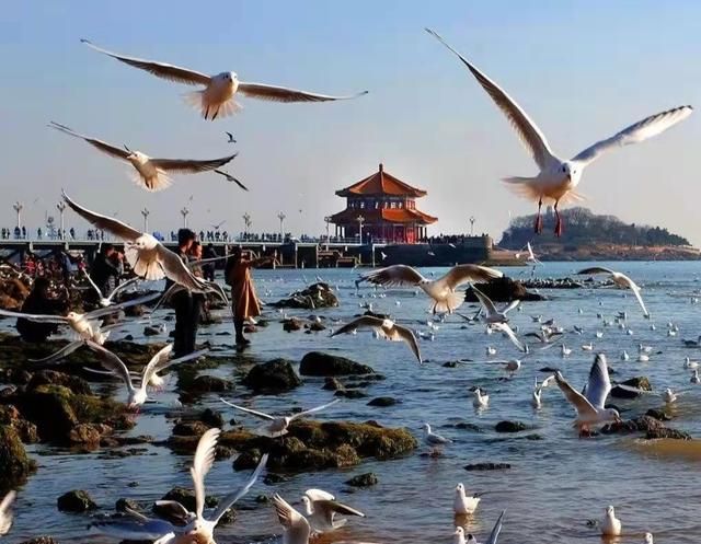 【栈桥】喂海鸥吹海风,南端防波堤内部的八角楼被称为“回澜阁”。