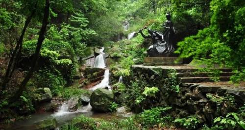 从荫山街出发,走下坡路便到了剑池,这里是莫干山的瀑布群,剑池可能比想象中袖珍些,但竹林和瀑布很是清凉。池边有一尊干将、莫邪铸剑的铜雕,是莫干山的标志,游人来这儿总不忘拍张照。