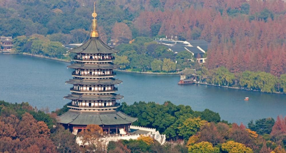 雷峰塔(Leifeng Tower),又名黄妃塔、西关砖塔,位于浙江省杭州市西湖区,地处西湖风景区南岸夕照山之上,是吴越国王钱俶为供奉佛螺髻发舍利、祈求国泰民安而建,始建于北宋太平兴国二年(977年),历代屡加重修,现存建筑以原雷峰塔为原型设计,重建于2002年;是"西湖十景"之一,中国九大名塔之一,中国首座彩色铜雕宝塔。 雷峰塔主体为平面八角形体仿唐宋楼阁式塔,各层盖铜瓦,转角处设铜斗拱,飞檐翘角,总高71.679米,总占地面积3133平方米,总建筑面积为6089平方米;塔身对径28米,边长11米,周长88米,塔底为原雷峰塔遗址。 西溪国家湿地公园,距离杭州西湖五公里,在杭州天目山路延伸段,是罕见的城中次生湿地。曾与西湖、西泠并称杭州"三西",是目前国内第一个也是唯一的集城市湿地、农耕湿地、文化湿地于一体的国家湿地公园,具有"杭州之肾"和"副西湖"美誉。园区约70%的面积为河港、池塘、湖漾、沼泽,正所谓"一曲溪流一曲烟",整个园区六条河流纵横交汇,水道如巷、河汊如网、鱼塘栉比如鳞、诸岛棋布,形成了西溪独特的湿地景致。